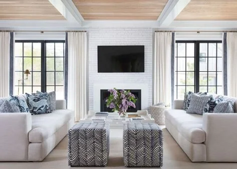 A gorgeous modern coastal living features two oversized cream sofas sitting across from each other, two square ottomans faces a white painted brick fireplace flanked by glass and steel windows bringing in glorious natural light into the room. Similar sofas, HERE, HERE, HERE | Similar Ottomans, HERE,