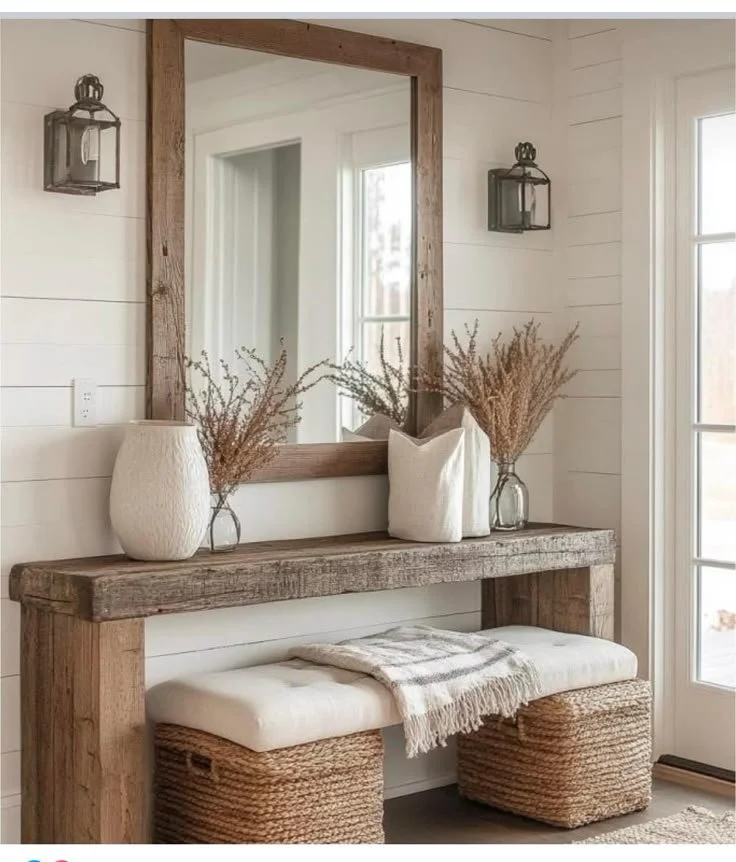 A wooden console table with a live edge or a stone bench can anchor the space.