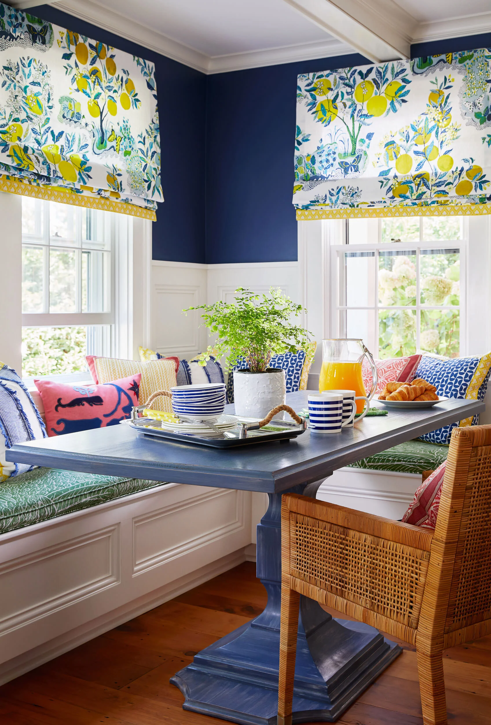 Obsessed with the roman shades- I love the yellow, white and green cheery patter that frames the windows in the nook and kitchen. The cozy kitchen dining nook has generous banquet seating .