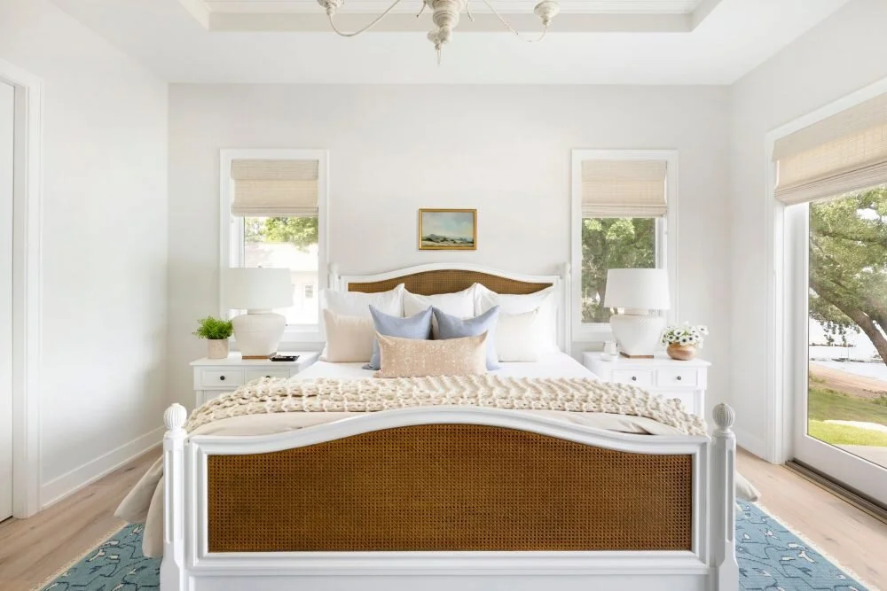 Rattan island stools at white kitchen island complement a light and airy appeal in this lakeside kitchen.