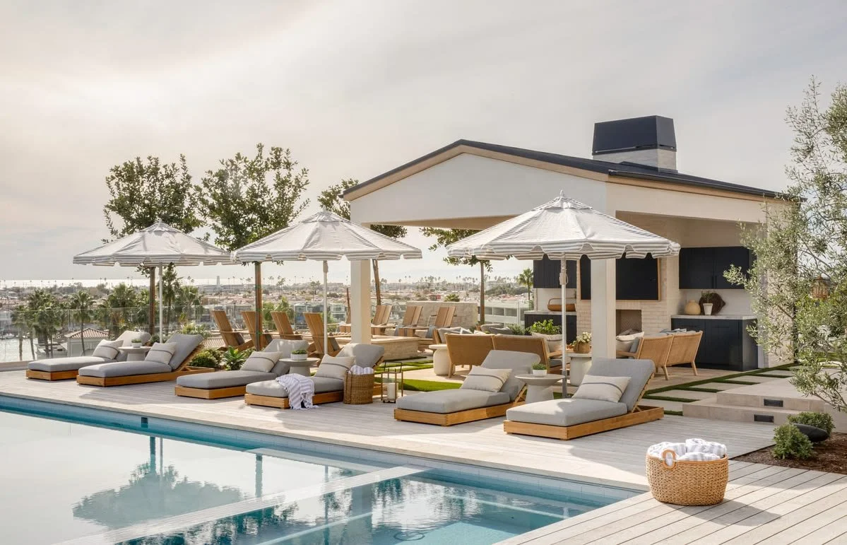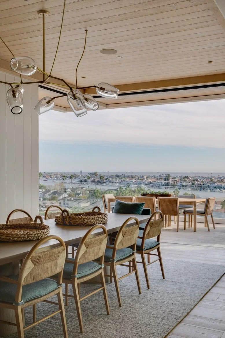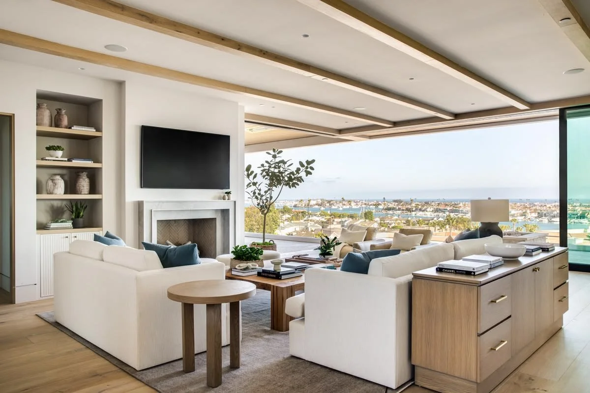 This modern coastal residence in Corona del Mar is designed by Brooke Wagner Design reflects a beautifully restrained approach to California living, where clean architectural lines meet soft natural textures and a warm neutral palette. Light oak, layered linens, and subtle coastal tones create interiors that feel bright, refined, and effortlessly livable. The outdoor living space is especially remarkable, designed as a true continuation of the home with inviting lounge seating, a fire feature, and thoughtfully integrated landscaping that captures the relaxed elegance of coastal entertaining. Large openings between indoors and out allow the home to feel open, airy, and deeply connected to its surroundings, making every space feel equally suited for quiet mornings or evening gatherings by the coast.