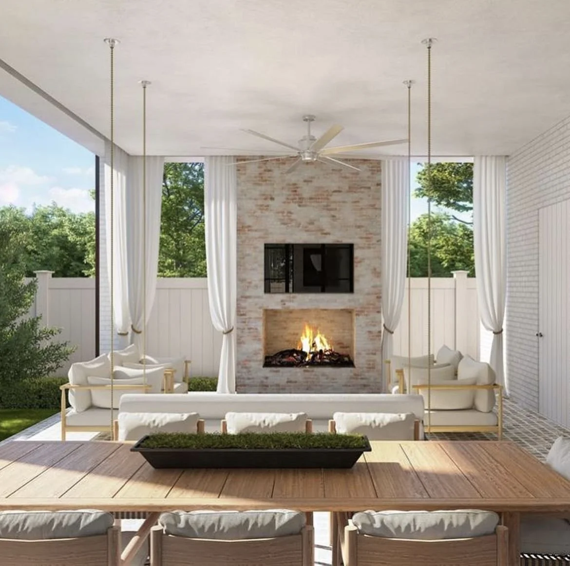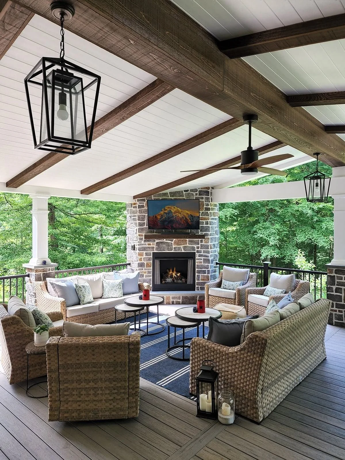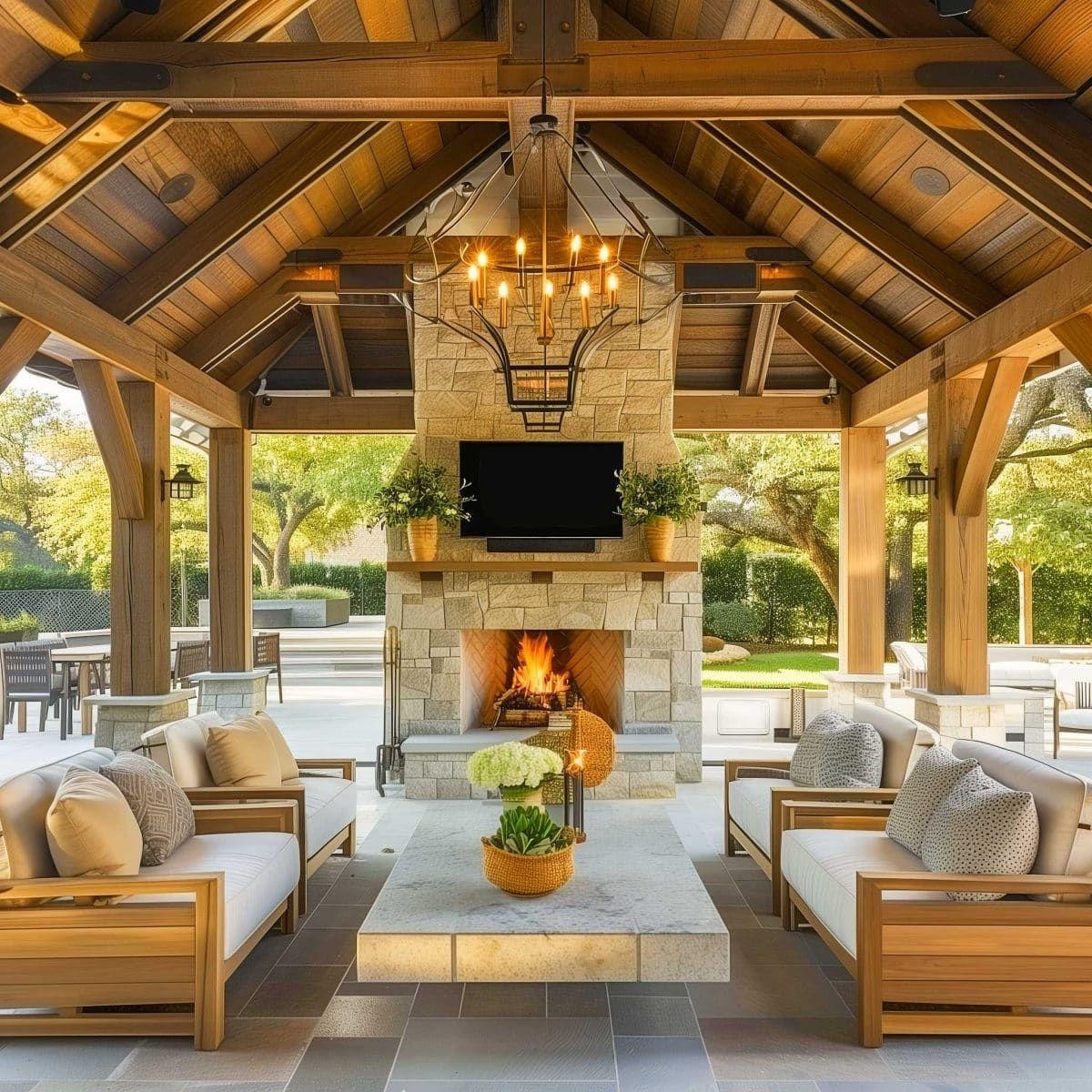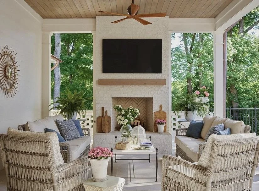 Classic covered patios tend to emphasize symmetry, architectural detail, and enduring materials. Brick flooring, stone fireplaces, traditional columns, and elegant lantern lighting often shape these outdoor rooms, creating spaces that feel established and timeless.