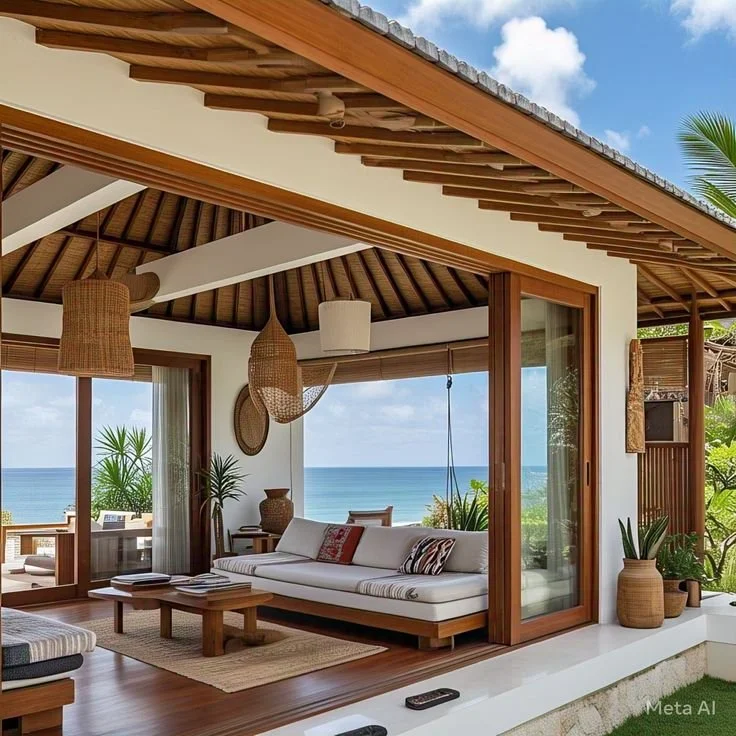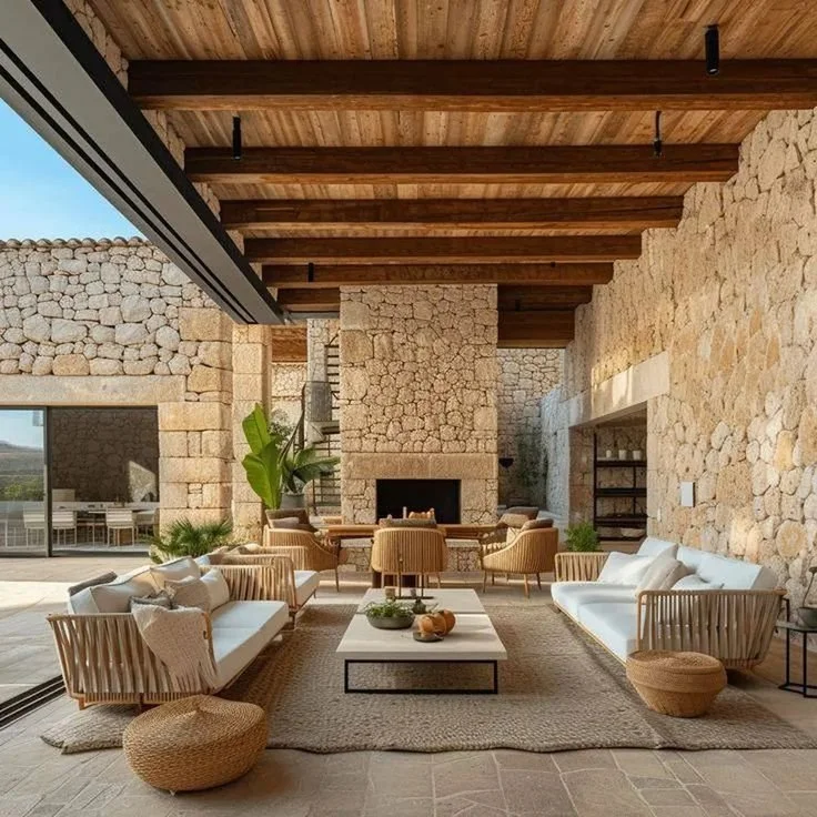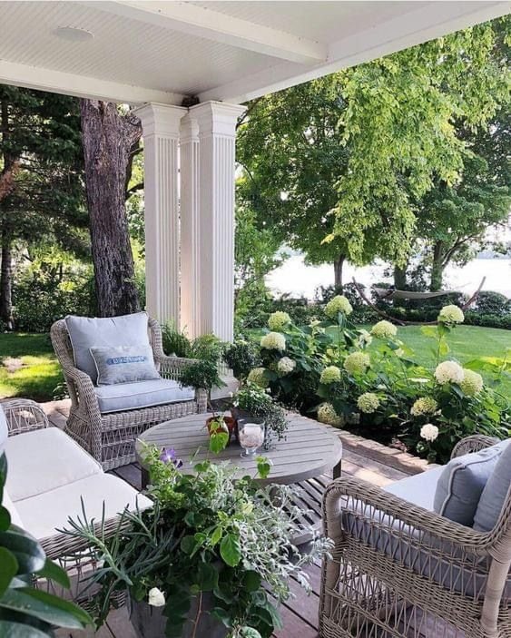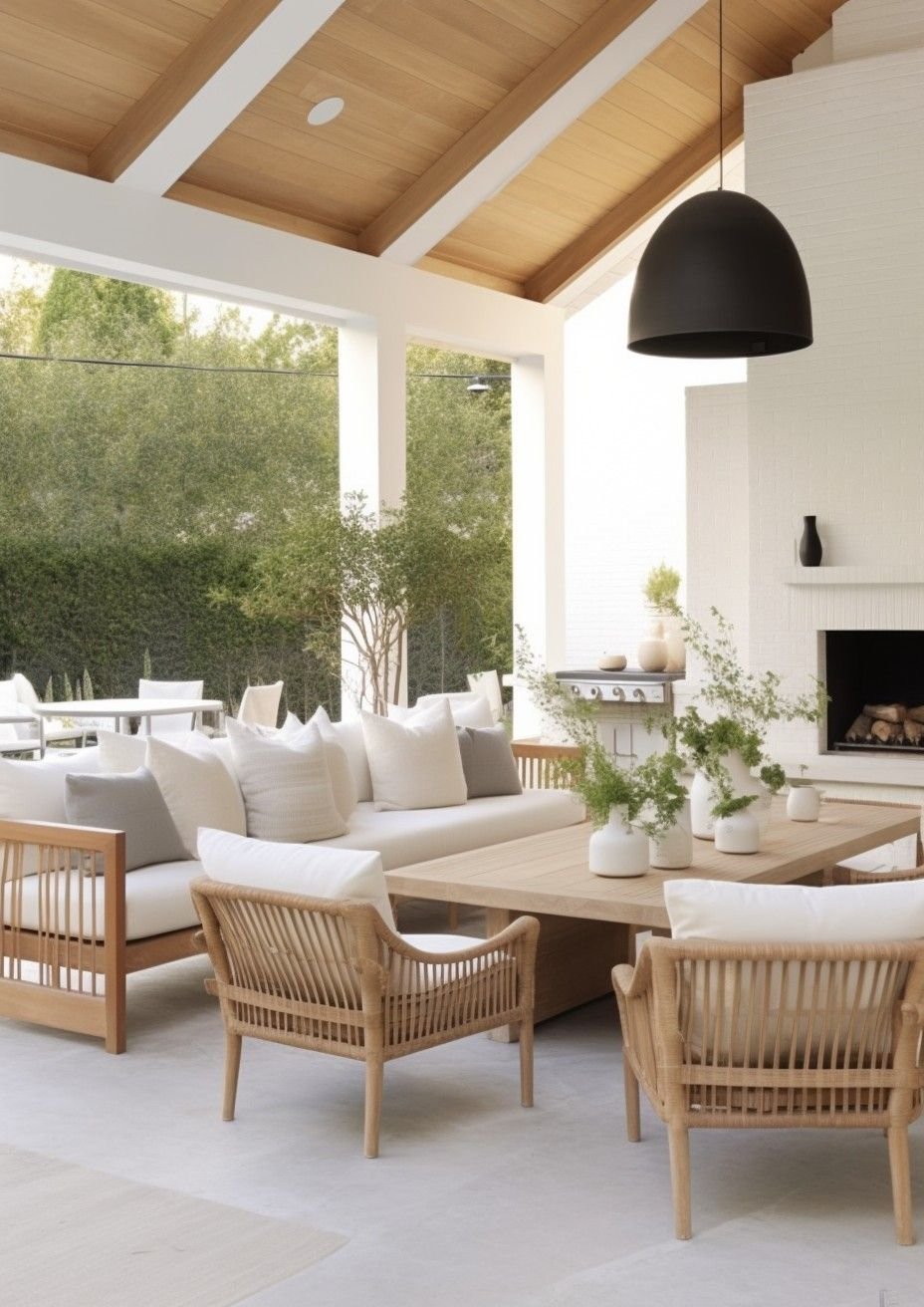 Accent chairs in woven finishes, teak frames, or rope details bring dimension while maintaining the relaxed simplicity that defines coastal style. Covered ceilings in painted wood, natural beams, or light-toned planks help reinforce the open and breezy character these patios are known for.