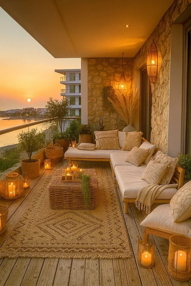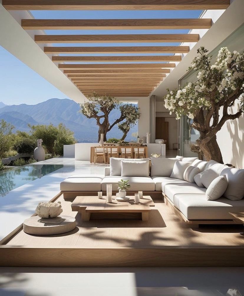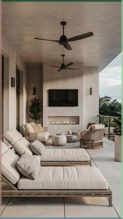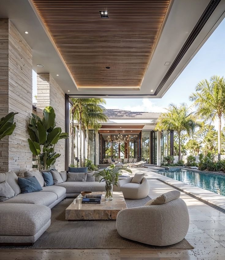 Modern coastal patios often embrace a palette of soft neutrals, warm woods, airy textiles, and clean-lined furnishings. Outdoor sofas in white, sand, or light gray create an easy sense of comfort, often layered with textured pillows and natural materials that echo the tones of the surrounding landscape.