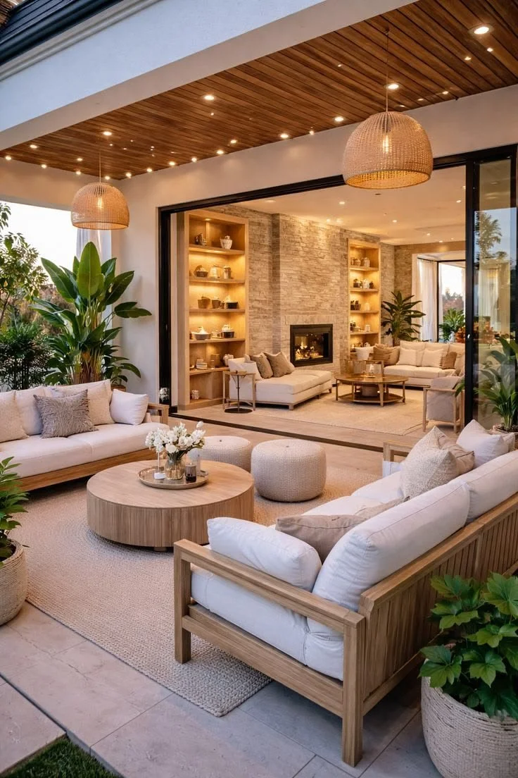 California-style covered patios often blur the line between indoor and outdoor living more than any other style. Wide openings, sliding glass walls, natural materials, and open layouts allow the patio to function as a true extension of the home.